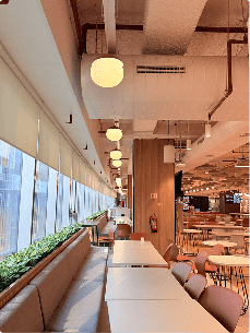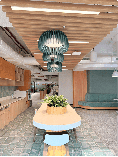Ribbon customised fixtures and Strapline lighting define spatial flow, while acoustic lighting solutions improve sound quality and visual comfort simultaneously, creating a balanced workspace.